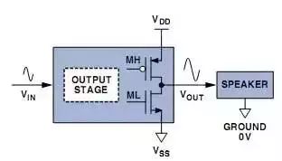 線性放大器輸出級(jí)直接連接到揚(yáng)聲器(有些情況下通過電容器連接)。如果輸出級(jí)使用雙極性結(jié)型晶體管(BJT),它們通常工作在線性方式下,具有大的集射極電壓。輸出級(jí)也可以用互補(bǔ)金屬氧化物半導(dǎo)體(CMOS)晶體管實(shí)現(xiàn),如圖1所示。
