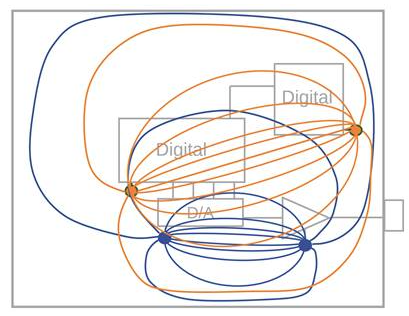 如果考慮返回電流,雖然模擬電路和數(shù)字電路部分隔離開了,但是分割地層后有四條數(shù)字走線將D/A轉換器連接到其中一個數(shù)字元件,這些信號也需要返回路徑。這些電流必須從D/A元件的接地引腳到達數(shù)字元件的接地引腳,分割后迫使這些電流與模擬電流共享平面的同一區(qū)域,模數(shù)信號混合了,沒有起到分割的作用。