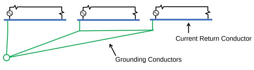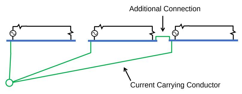 圖4顯示了另一種實現(xiàn)方式,其中接地導體連接在多個點,但它們?nèi)匀灰詥蝹€點為參考。其中一個例子是建筑物中的電源接地,每個接地設備都有一條通往建筑電氣服務的專用有線路徑,在多個點連接接地導體不會降低接地方案的有效性。