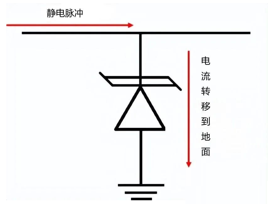當(dāng) ESD 發(fā)生在信號(hào)線上并且信號(hào)線上存在 TVS 二極管時(shí),二極管將開始導(dǎo)通,脈沖可以通過二極管。這允許二極管將 ESD 脈沖從受保護(hù)電路轉(zhuǎn)移開。典型的連接方式是將陽極接地,這樣 ESD 脈沖就會(huì)傳到地里。只要接地區(qū)域存在低阻抗路徑,脈沖就會(huì)從受保護(hù)的組件轉(zhuǎn)移開。
