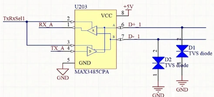 除了選擇合適的 TVS 二極管外,保護(hù)的有效性還取決于 PCB 布局本身。下面這個(gè)示例中2個(gè)雙向TVS二極管并聯(lián)連接到下面的示意圖中保護(hù)的電路。示意圖顯示了TVS二極管與MAX3485 收發(fā)器的典型連接: