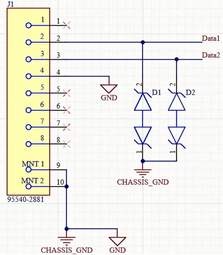 數(shù)據(jù)線上兩個(gè) TVS 二極管的連接示例