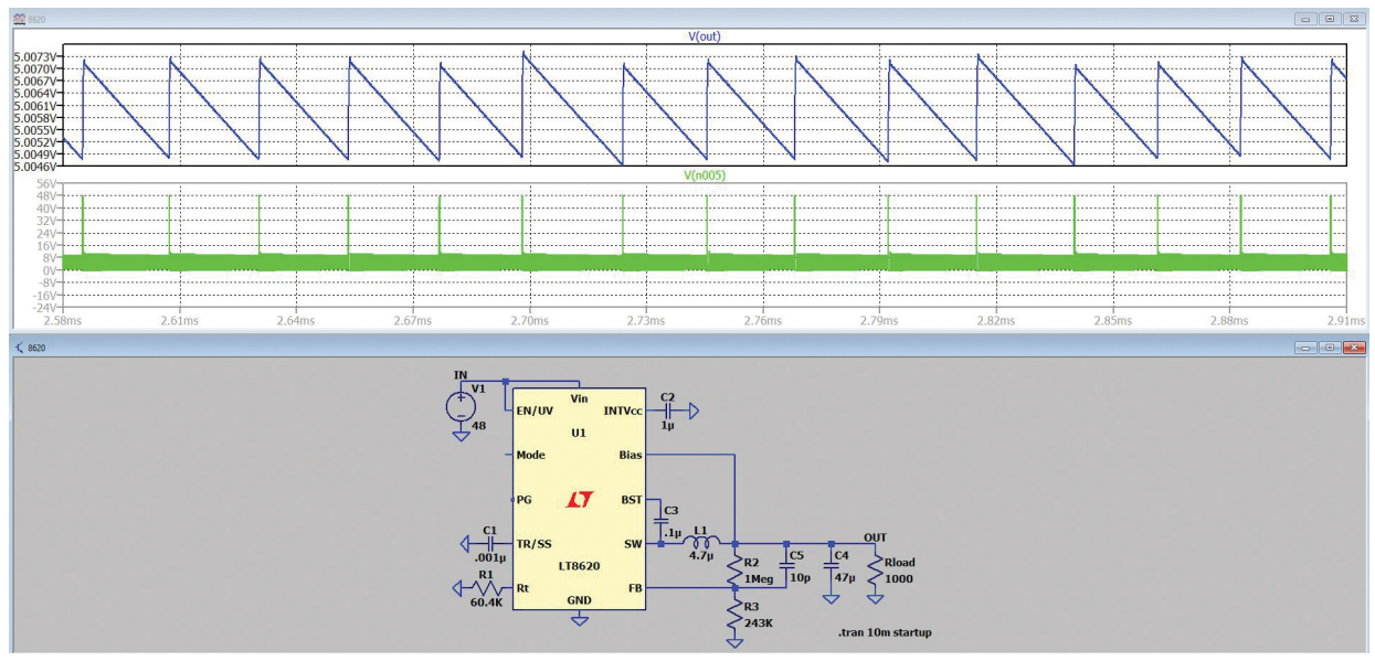 圖2. 使用LTspice®,仿真處于突發(fā)模式下的 LT8620 降壓型開關穩(wěn)壓器。