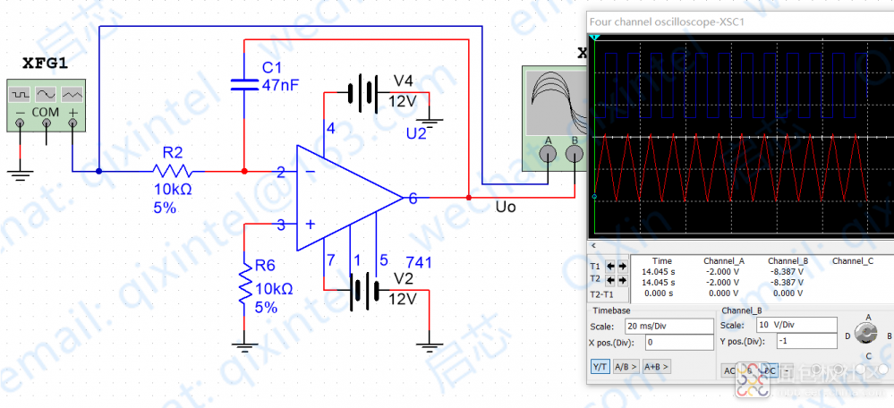 如下圖,仿真結(jié)果在右邊,對著圖形分析就比較容易了。示波器上面藍色的方波是信號發(fā)生器產(chǎn)生的,下面的鋸齒波就是通過積分電路后的波形。