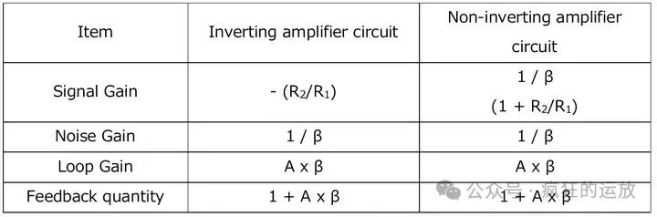 我們可以列舉一下同相/反相運(yùn)算放大器Signal gain信號(hào)增益、Noise gain噪聲增益、Loop Gain環(huán)路增益的表格: