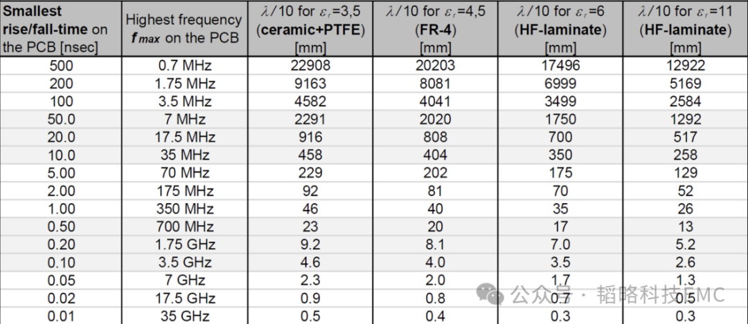其中,t10%-90%數(shù)字信號(hào)斜率從10%上升至90%的上升或下降時(shí)間(取小值)。為了方便各位,下表顯示了高頻數(shù)字信號(hào)上升/下降時(shí)間、其相應(yīng)的最高頻率內(nèi)容 fmax 和 λ/10 :
