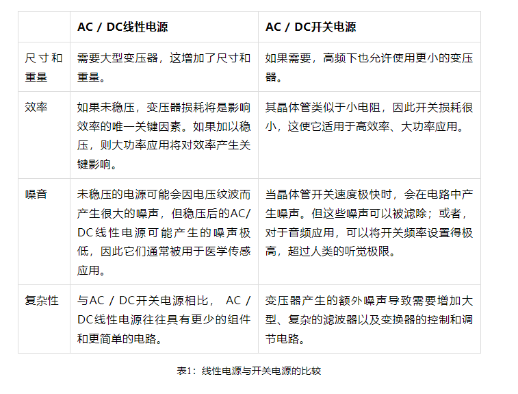 表1總結(jié)了AC / DC線性電源和開關(guān)電源之間的區(qū)別。