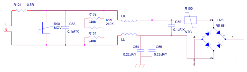 在電源輸入端會(huì)串聯(lián)一顆2.2歐左右的電阻,這樣可以限制電容充電電流,還可以起到保險(xiǎn)的作用,就是用電阻代替保險(xiǎn)管了,節(jié)省了一個(gè)元件,有短路時(shí),電阻不能通過(guò)大電流,就會(huì)燒斷,不會(huì)造成起火。還用用PCB上的銅箔做的很細(xì),代替保險(xiǎn)管的,當(dāng)有大電流時(shí),銅箔很細(xì),不同通過(guò)大電流,銅箔就會(huì)燒斷,保護(hù)后級(jí)不會(huì)擴(kuò)大故障,這種在小功率的電源中特別常見(jiàn)。