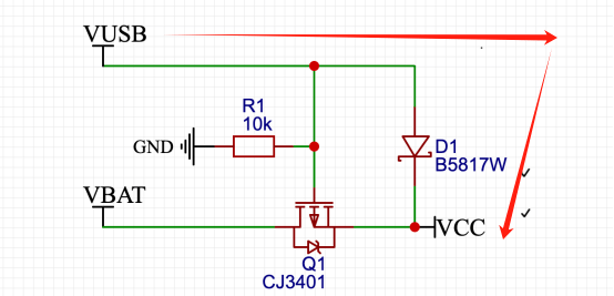 當(dāng)VUSB進(jìn)行供電時(shí)(5V),PMOS的G端:為5V,此時(shí)PMOS不導(dǎo)通,電壓經(jīng)過二極管D1直接到達(dá)VCC。如下圖: