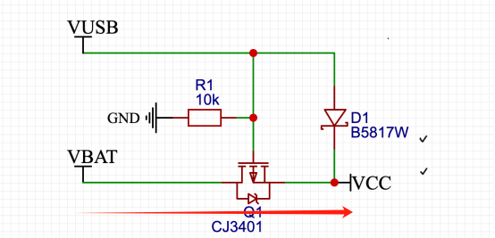當(dāng)VUSB斷開后,PMOS的G端的電壓(5V)由電阻R1下拉到GND,此時(shí)PMOS導(dǎo)通,VCC由VBAT(為鋰電池)供電。如下圖: