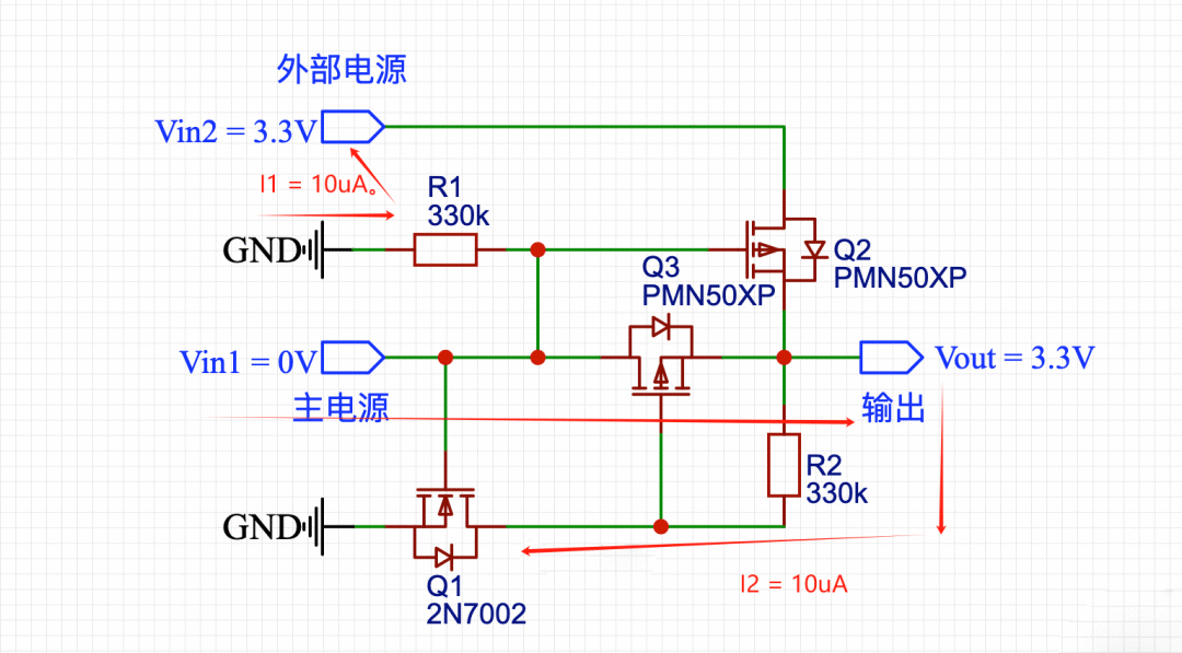 當(dāng)VIN1(主電源)斷開,Q1 NMOS截止,Q2 PMOS的柵極通過R1下拉,Q2導(dǎo)通;Q3 PMOS的柵極通過R2上拉,Q3截止。