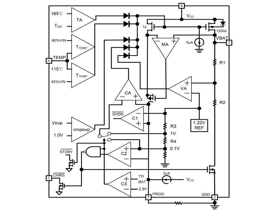 壓固定于4.2V。充電電流可通過PROG 腳外接一